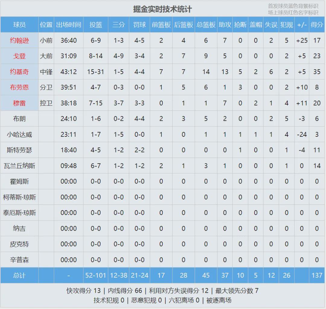 掘金此役三人得分20+!约基奇31投15中,三分5中1,罚球4中4,砍下35分14篮板13助攻5抢断2盖帽6失误。第四节最后时刻,约老师有绝杀机会,可惜抛投和补篮不中。约基奇生涯两次砍下35分10板10助5断,NBA历史首人!