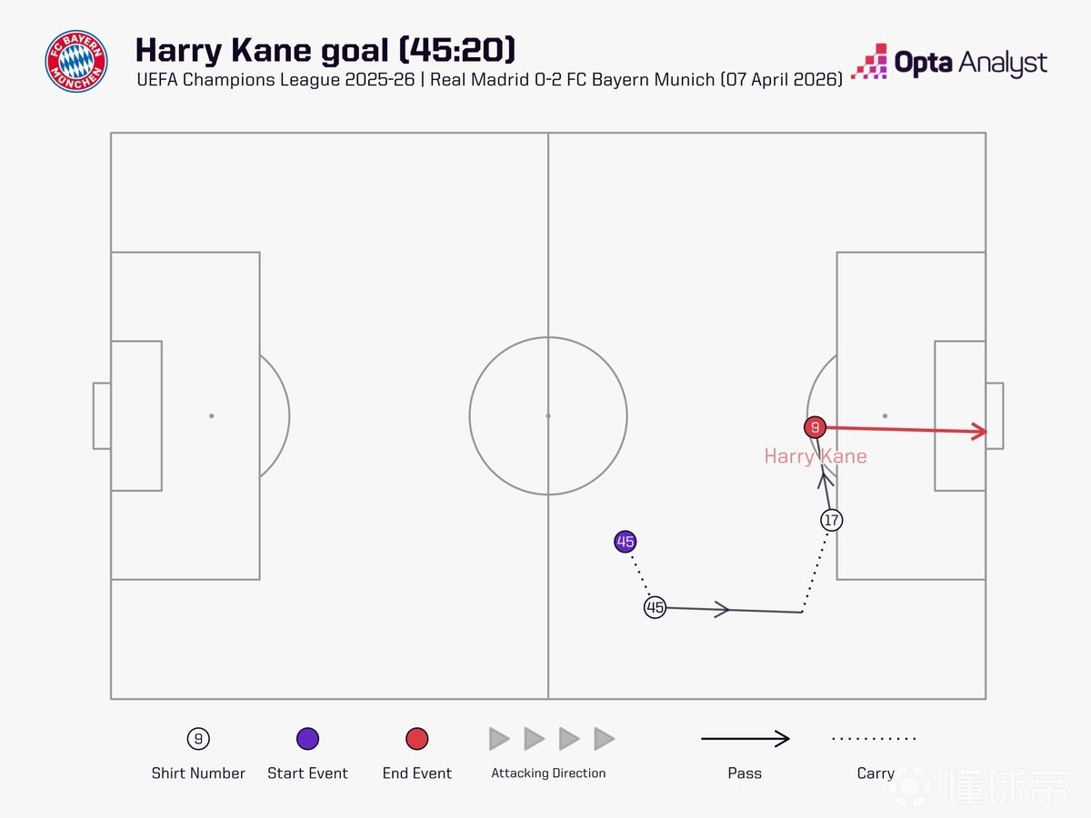 此役客场对阵皇家马德里,凯恩在下半场开场仅20秒便取得进球。