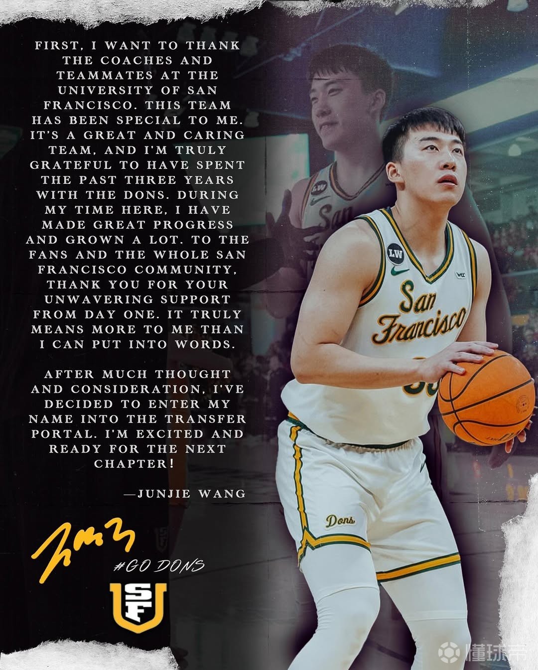 “这是一支优秀且有爱的球队,我真心感激过去三年能与旧金山大学一起度过。在这里的时光里,我取得了很大的进步,成长了许多。致球迷们以及整个旧金山社区,感谢你们从第一天起就给予我的坚定支持。这份情谊我难以言表,对我意义非凡。”