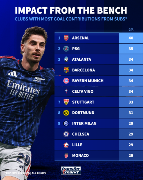 目前,阿森纳在本赛季的替补进球和助攻榜上高居榜首。
