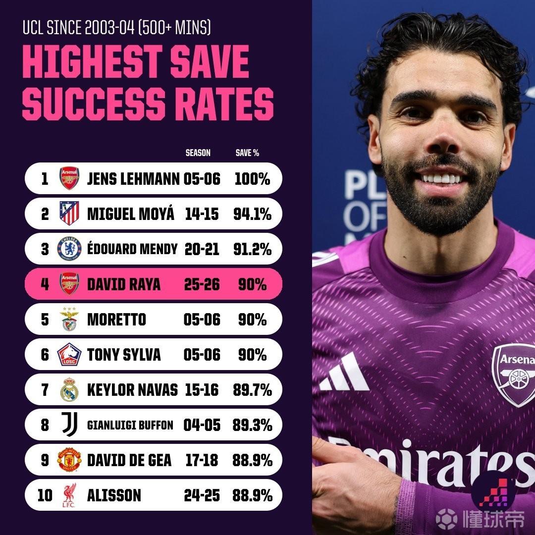 北京时间4月8日,根据著名数据机构Opta的统计,阿森纳门将戴维-拉亚本赛季在欧冠的扑救成功率高达90%。