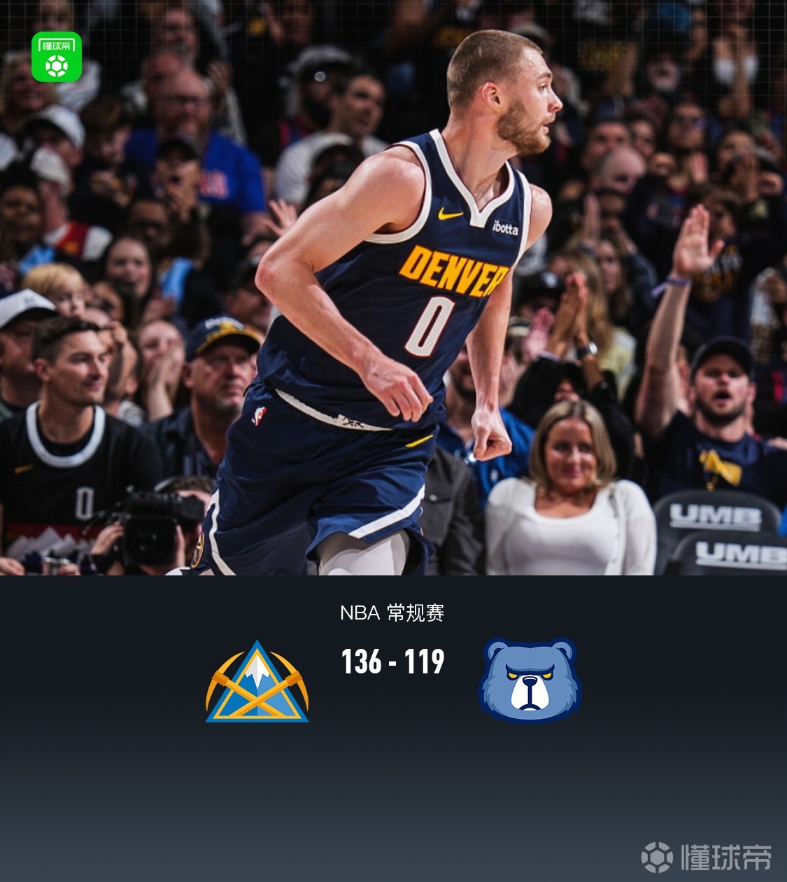 第四节掘金瓦兰丘纳斯拿下10分,灰熊考沃德拿下11分,最终掘金136-119战胜灰熊
