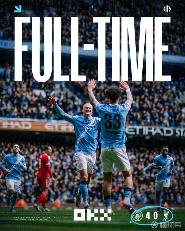 在今天晚上进行的足总杯四分之一决赛中,曼城主场4-0击败利物浦,晋级4强。