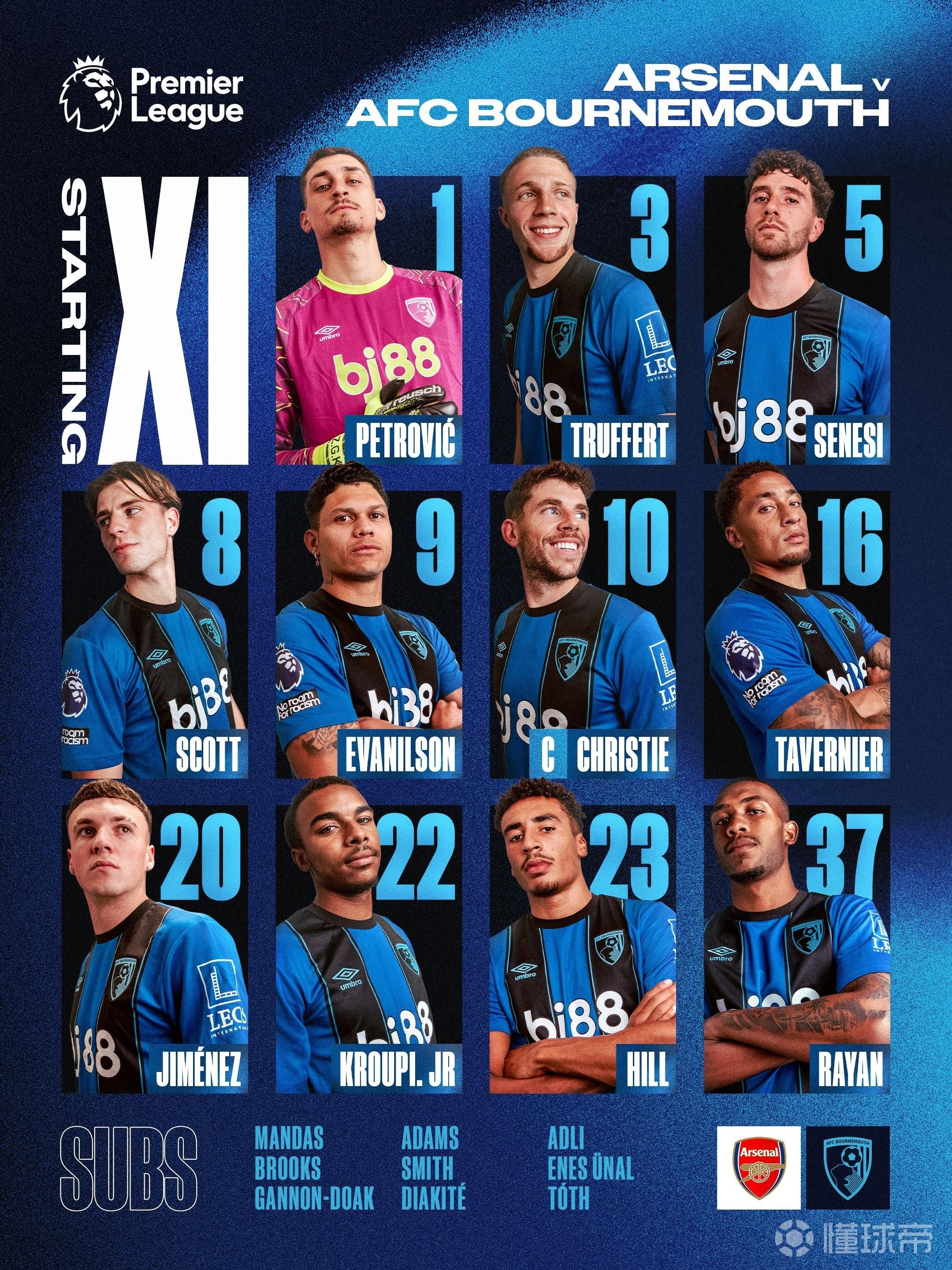 伯恩茅斯首发:1-彼得罗维奇、3-特吕费尔、5-塞内西、23-詹姆斯-希尔、20-阿莱士-希门尼斯、10-克里斯蒂、8-斯科特、22-克鲁皮、16-塔韦尼耶、37-拉扬、9-埃万尼尔松