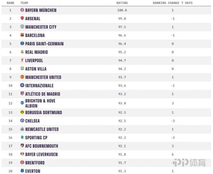 OPTA全球俱乐部实力榜:拜仁居首,前10英超占4席 发布时间:2026-04-14 00:24:00 | 浏览: 次 直播信号源 体育直播专业赛事解说 免费直播 4k超清直播 美女专业解说(无插件) 著名数据机构OPTA对全球超过10000家俱乐部打造了一个评分系统,评分范围从0到100。其中,0分代表全球最弱的球队,而100分则代表全球最强的球队。 责任编辑: 体育24小时热点 标签: 体育 PP体育 聚力体st育 英超直播 西甲 亚冠直播 欧冠直播 德甲直播 欧联杯 CBA 篮球直播 WWE直播 UFC直播 体育直播
