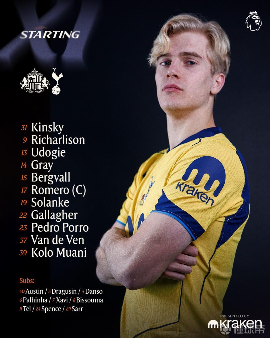 热刺首发:31-金斯基、37-范德芬、13-乌多基、23-波罗、17-罗梅罗、15-贝里瓦尔、14-格雷、22-加拉格尔、39-穆阿尼、9-里沙利松、19-索兰克