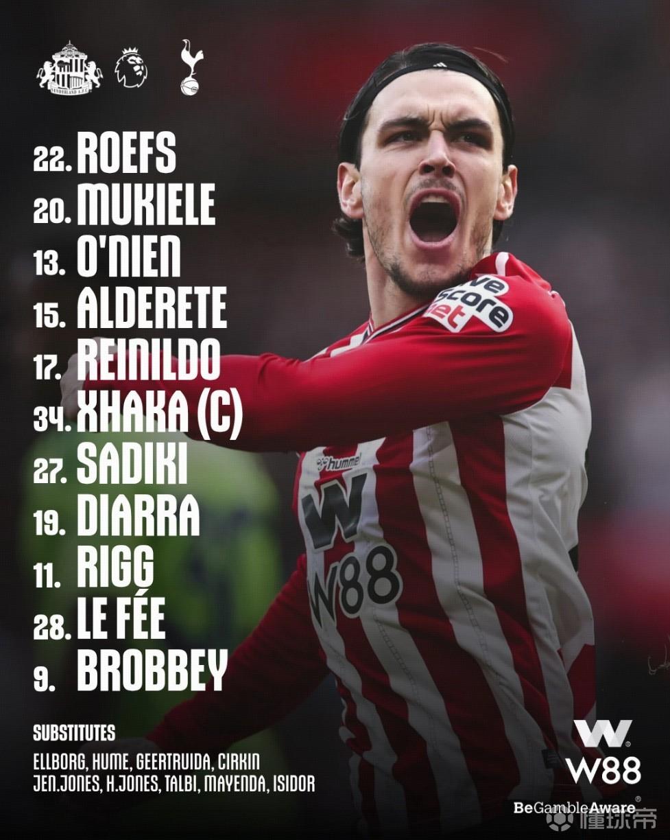 桑德兰首发:22-罗埃夫斯、20-穆杰莱、13-奥尼安、17-雷尼尔多、14-阿尔德雷特、11-里格、27-萨迪基、19-迪亚拉、28-勒费埃、34-扎卡、9-布罗贝伊