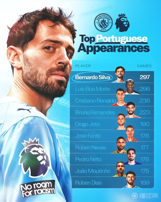 根据统计,在今晚的比赛之前,B席与博阿-莫特的英超出场次数相同,但现在,B席的出场次数达到了297次,超过了博阿-莫特,成为英超历史出场最多的葡萄牙球员,他的出场数也高于C罗(236场)和B费(223场)。